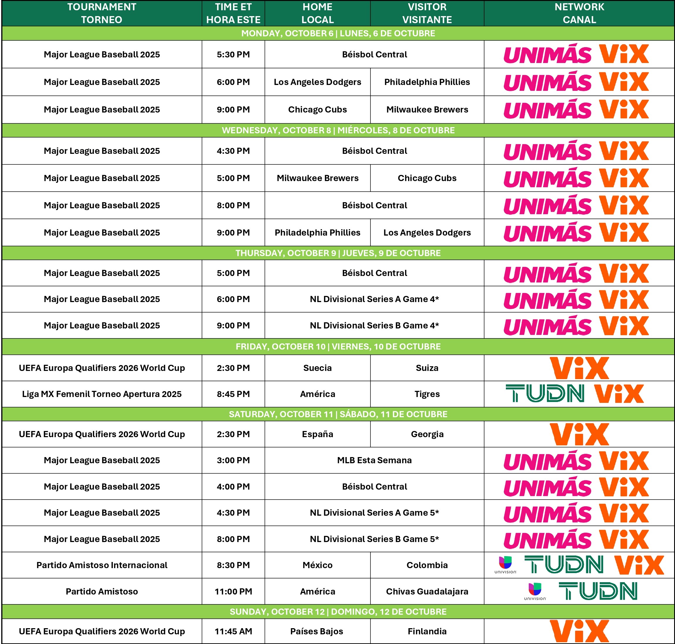 De ser necesario, se jugarán partidos adicionales el jueves 9 y el sábado 11 de octubre. Todos los partidos podrán verse en vivo por UniMás y ViX.