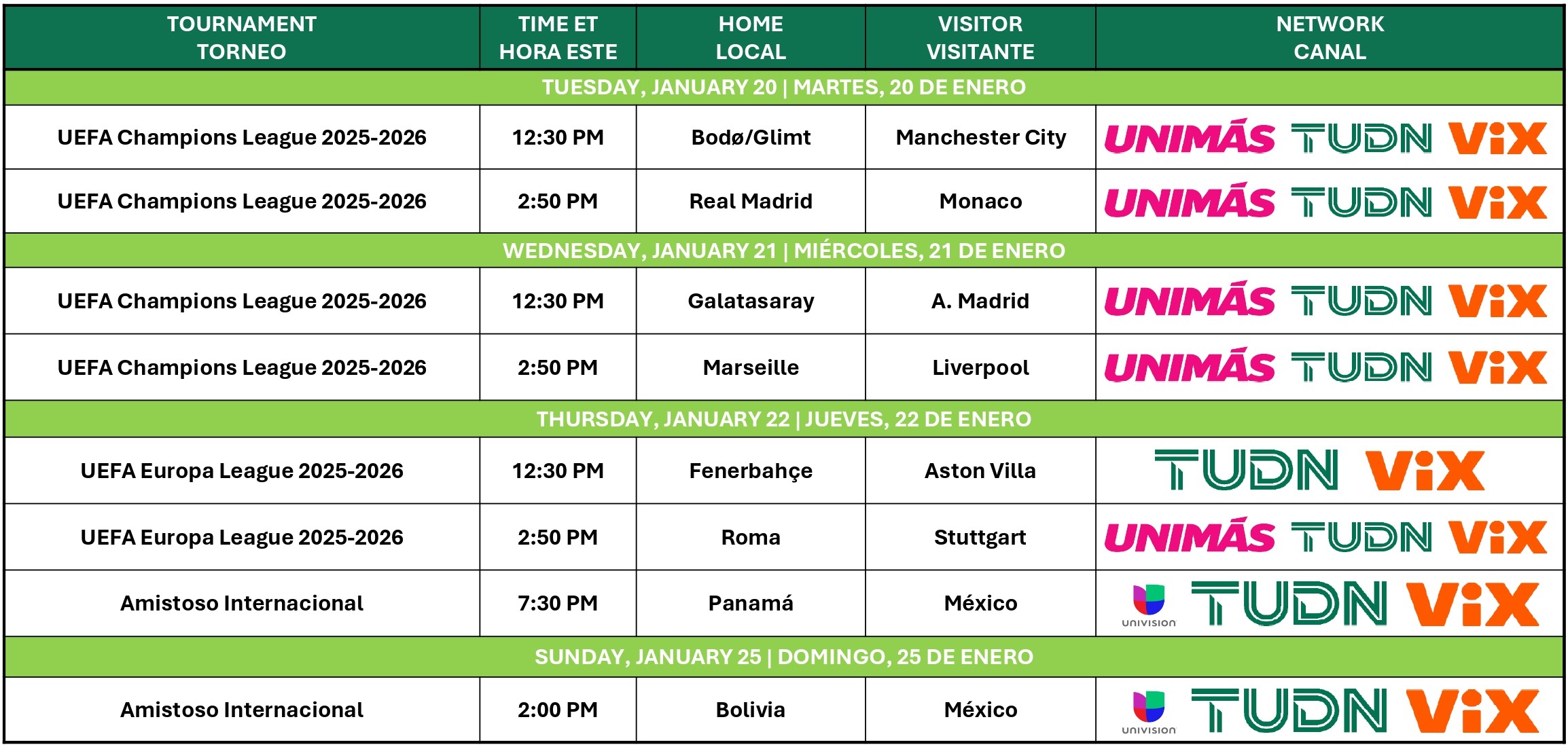 The intensity continues on Wednesday, January 21, as Galatasaray faces Atlético de Madrid at 12:30 p.m. ET, followed by a marquee clash between Marseille and Liverpool at 2:50 p.m. ET. All of these matches will air simultaneously on UniMás, TUDN, and ViX.