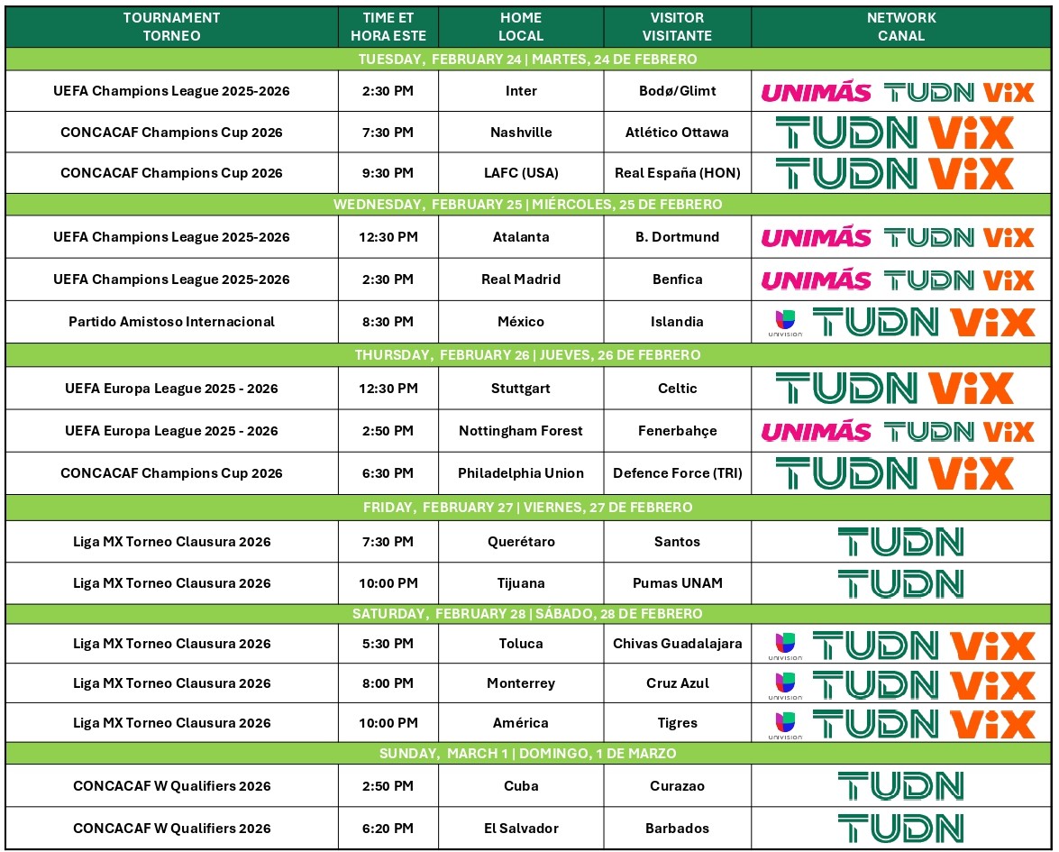 The Mexican national team continues its 2026 FIFA World Cup preparations Wednesday, Feb. 25, on Univision, TUDN, and ViX. Coverage begins at 8 p.m. ET with Fútbol Central ahead of the Mexico vs. Iceland clash, kicking off at 8:30 p.m. ET live from Corregidora Stadium in Querétaro.