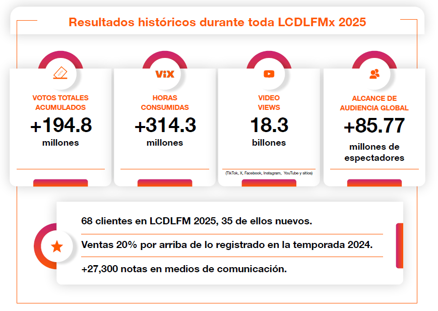 En TelevisaUnivision agradecemos a nuestras audiencias, a patrocinadores ya EndemolShine Boomdog por haber hecho de LCDLFMx 2025 un éxito rotundo y escribir una página más de historia mediática que seguirá el año entrante.